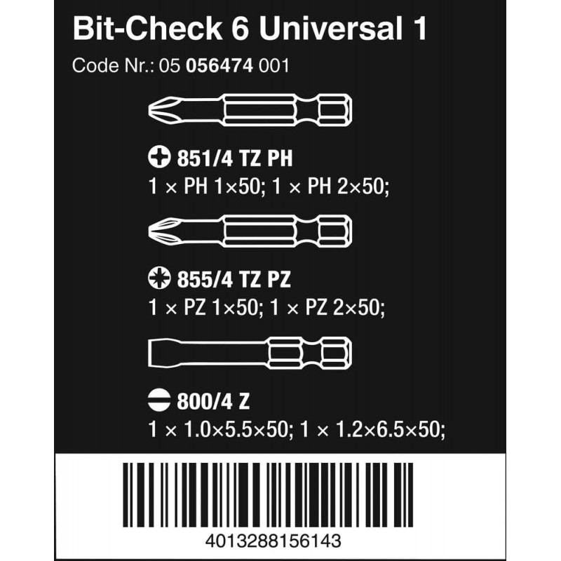 Wera Bit-Check 6 Universal 1 PZ/PH/SL Bits Seti 50mm 05056474001