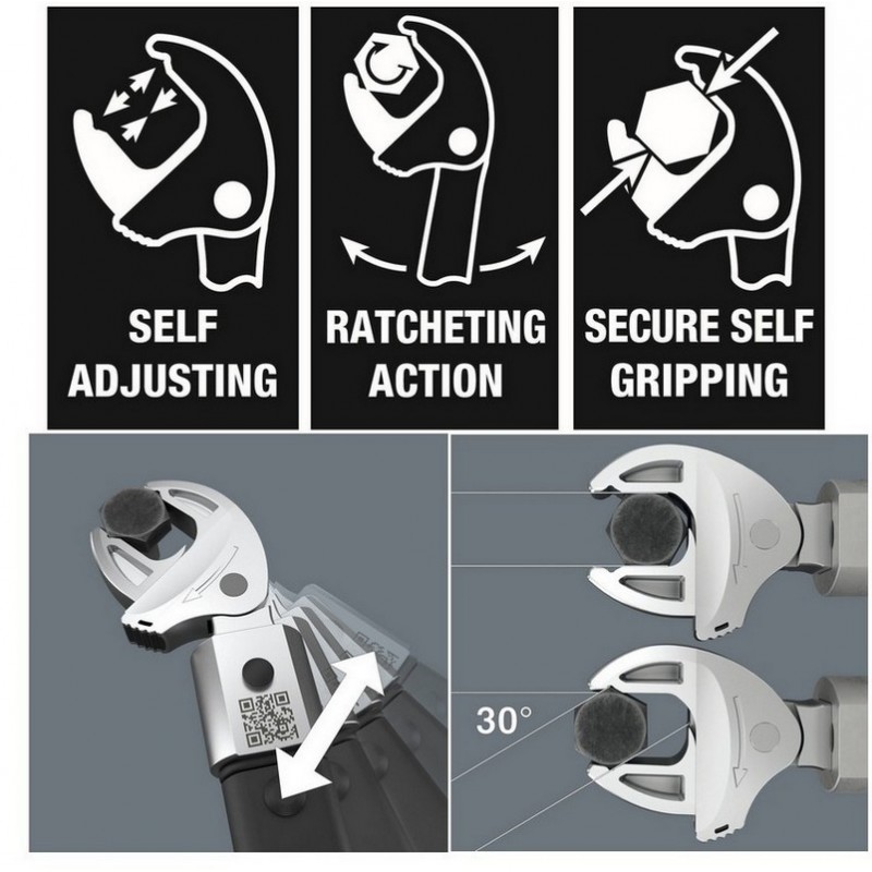 Altıgen vida başları ve cıvatalar için, 14x18 mm montajlı Click-Torque X ve XP serisi tork anahtarları için kendinden ayarlı uçlu anahtar. İlgili uygulama alanındaki tüm metrik ve İngiliz ölçülerini kapsar. Sürekli ve paralel çeneleri ile alet, birkaç tek anahtar boyutunun yerini alır. Alet altıgen cıvata veya vidaya takılırken gerekli boyut otomatik ve sürekli olarak ayarlanır. Entegre kol mekanizması, altıgen cıvata veya vidayı çeneler arasında güvenli bir şekilde sıkıştırarak kayma veya hasar riskini önemli ölçüde azaltır. Cırcır özelliği, aleti çıkarmadan hızlı ve tutarlı vidalama sağlar. Köşe genişliğindeki dikdörtgen prizmalar kullanılarak sadece 30°'lik bir dönüş açısı elde edilebilir.