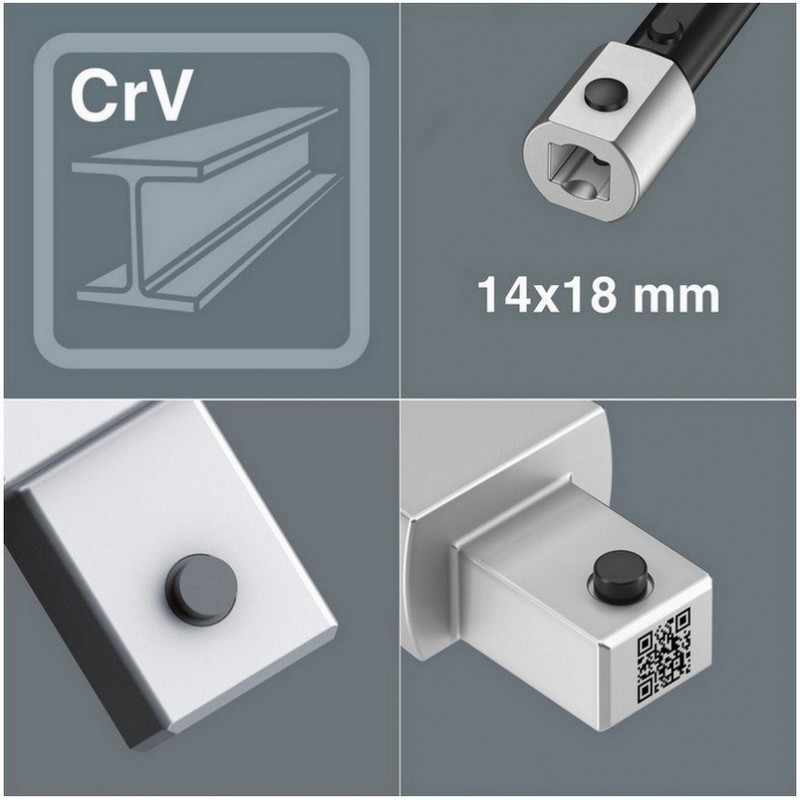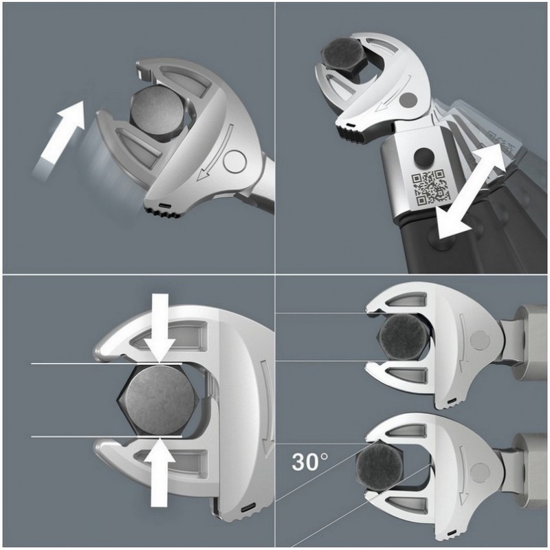 Altıgen vida başları ve cıvatalar için, 14x18 mm montajlı Click-Torque X ve XP serisi tork anahtarları için kendinden ayarlı uçlu anahtar. İlgili uygulama alanındaki tüm metrik ve İngiliz ölçülerini kapsar. Sürekli ve paralel çeneleri ile alet, birkaç tek anahtar boyutunun yerini alır. Alet altıgen cıvata veya vidaya takılırken gerekli boyut otomatik ve sürekli olarak ayarlanır. Entegre kol mekanizması, altıgen cıvata veya vidayı çeneler arasında güvenli bir şekilde sıkıştırarak kayma veya hasar riskini önemli ölçüde azaltır. Cırcır özelliği, aleti çıkarmadan hızlı ve tutarlı vidalama sağlar. Köşe genişliğindeki dikdörtgen prizmalar kullanılarak sadece 30°'lik bir dönüş açısı elde edilebilir.