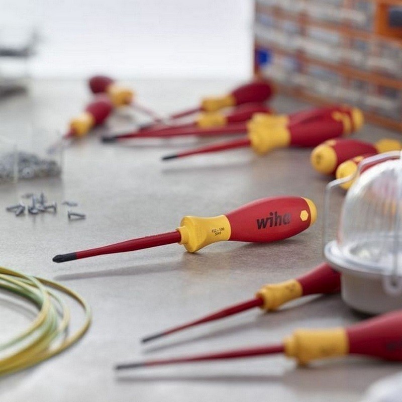Fastening screws by hand causes considerable strain on wrists and muscles in the long term. The highly ergonomically shaped SoftFinish® screwdriver provides a remedy, ensuring optimal transmission of hand force. The long, slender handle sizes can be used to fasten small screws quickly and firmly. There are also large handle sizes to fasten large screws which can be used to apply greater torques. The various handle sizes have also been matched to the consistently same-sized hand of screw-fastening professionals. The roll-off protection and screw symbol printed on the handle end ensure users work efficiently. Protective insulation has been integrated into the blade with the Wiha slimTECHNOLOGY specially developed for electric applications, thus ensuring blades which are up to 33% slimmer. This means low-lying screw and spring elements can also be easily reached. These insulated screwdrivers undergo routine individual piece testing as per the international IEC 60900 standard, as a result * providing users with a tool to work safely on live parts up to 1,000 V AC.
